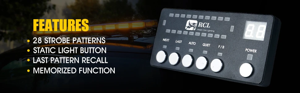 CONVENIENT EASY TO USE CONTROLLER - You can choose total 28 different strobe patterns. Pattern display on controller, Last pattern memory recall.
