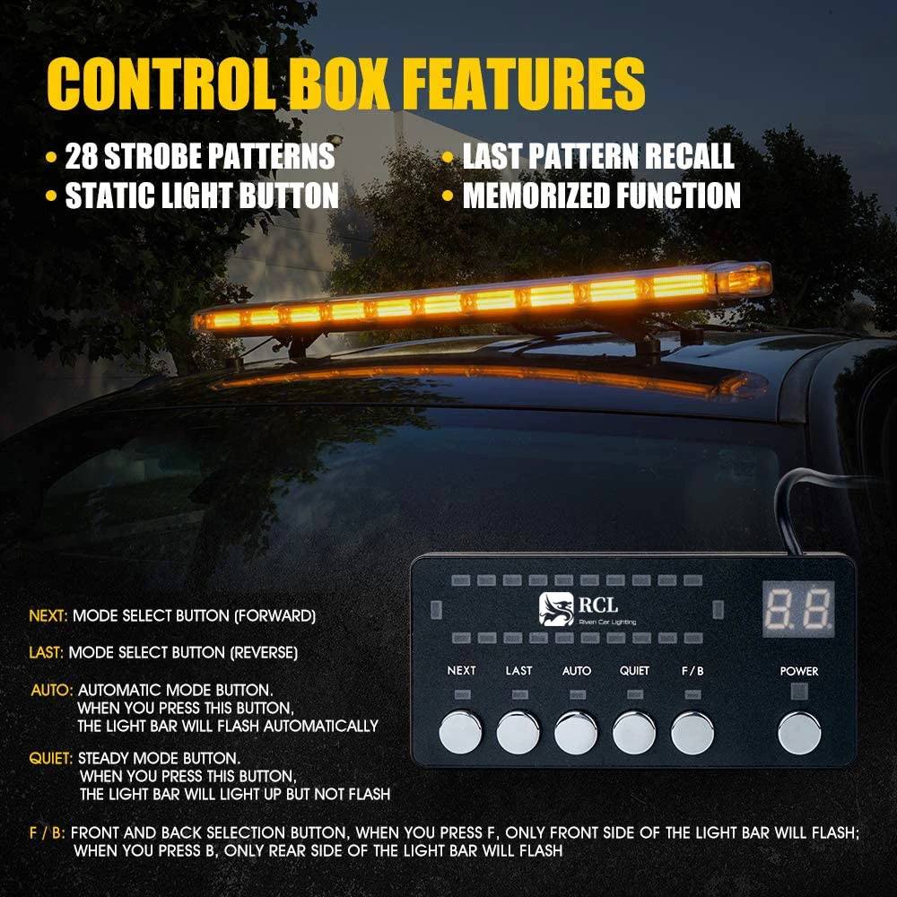 Modes: POWER: Turn On and Off Light Bar; NEXT: Mode select button (forward); LAST: Mode select button (reverse); AUTO: Automatic mode button. When you press this button, the light bar will flash automatically; QUIET: Steady mode button. When you press this button, the light bar will light up but not flash; F / B: Front and Back selection button, when you press F, only front side of the light bar will flash; when you press B, only rear side of the light bar will flash.