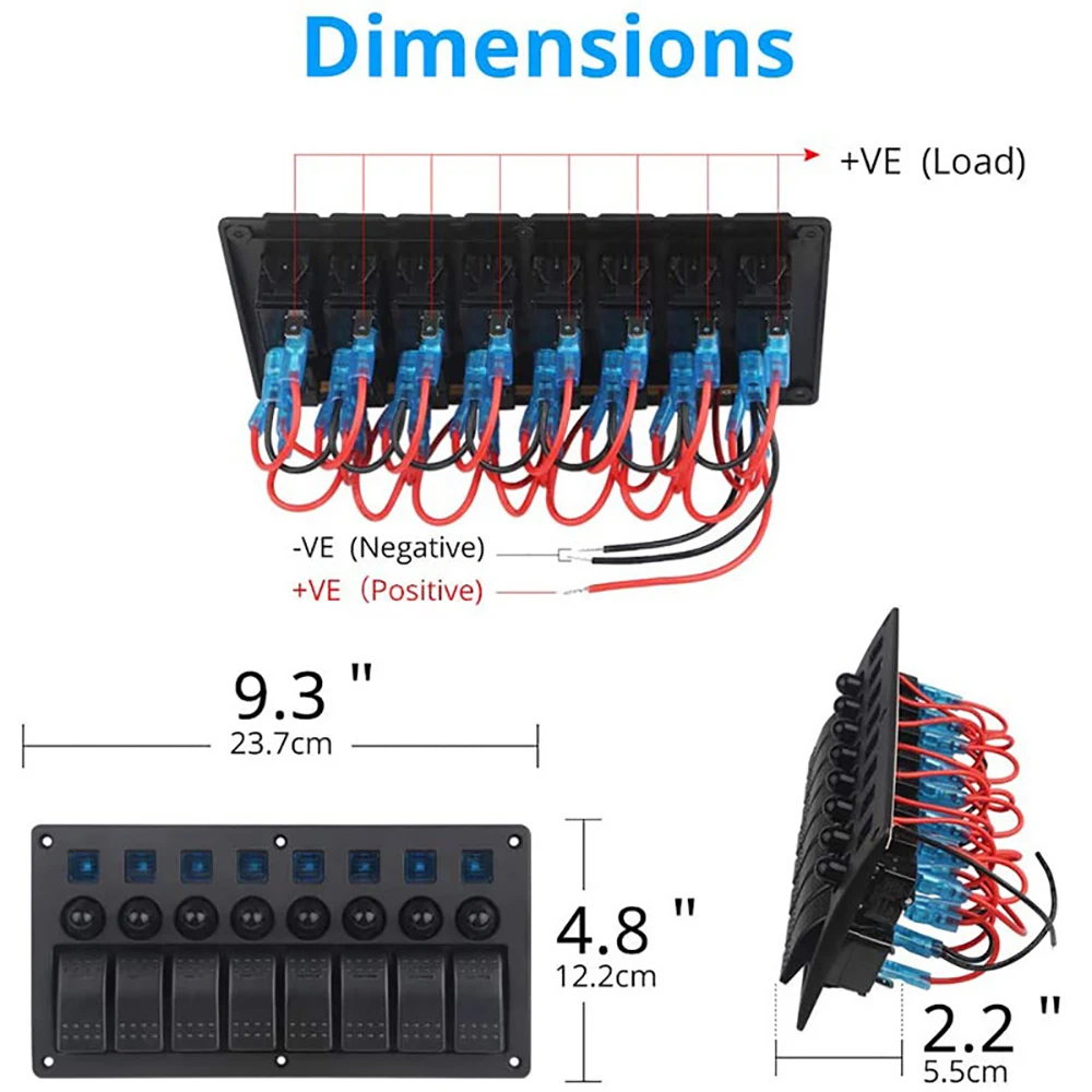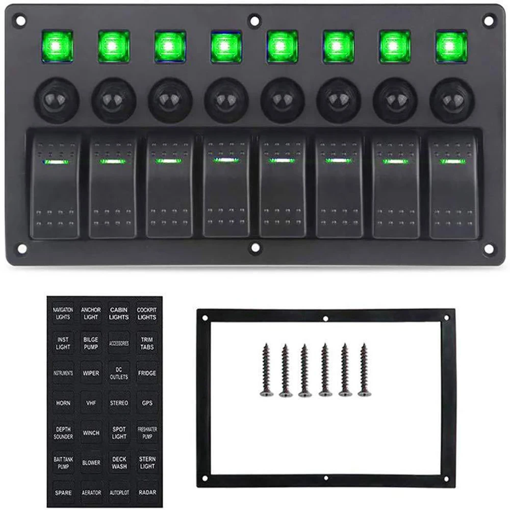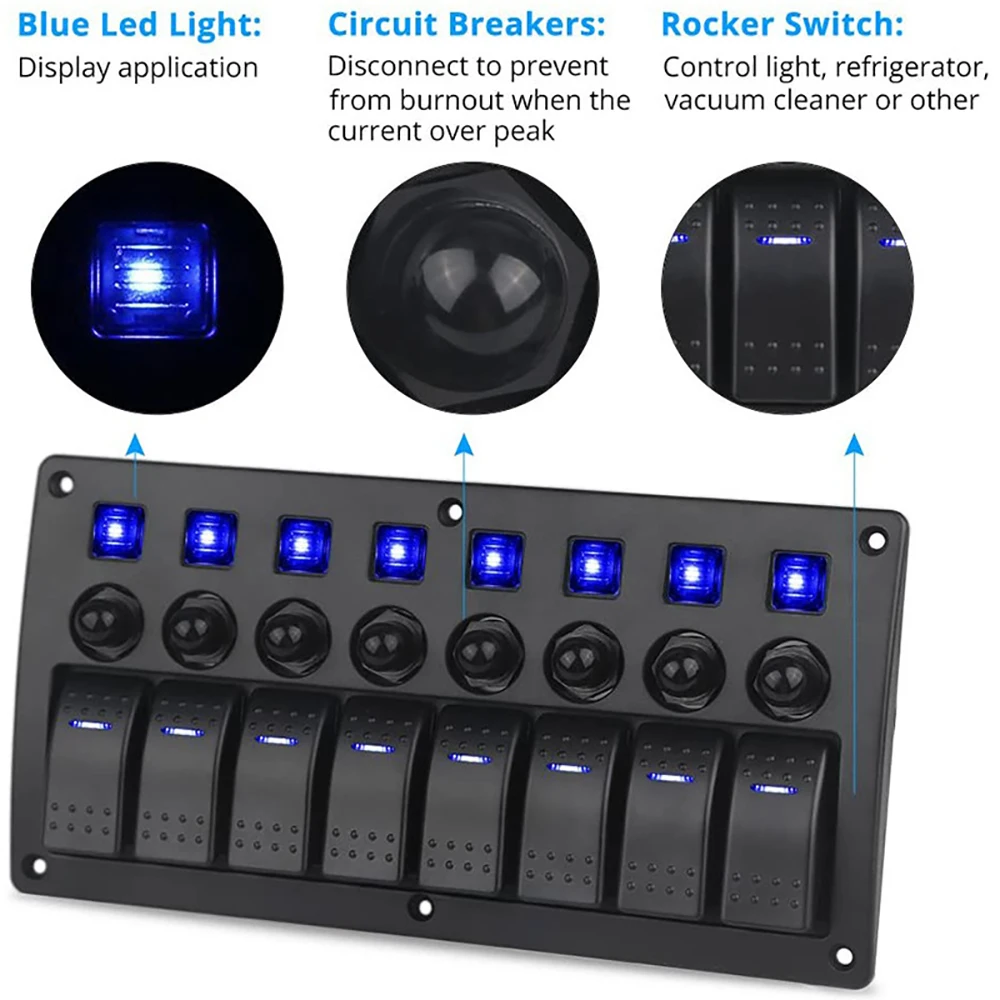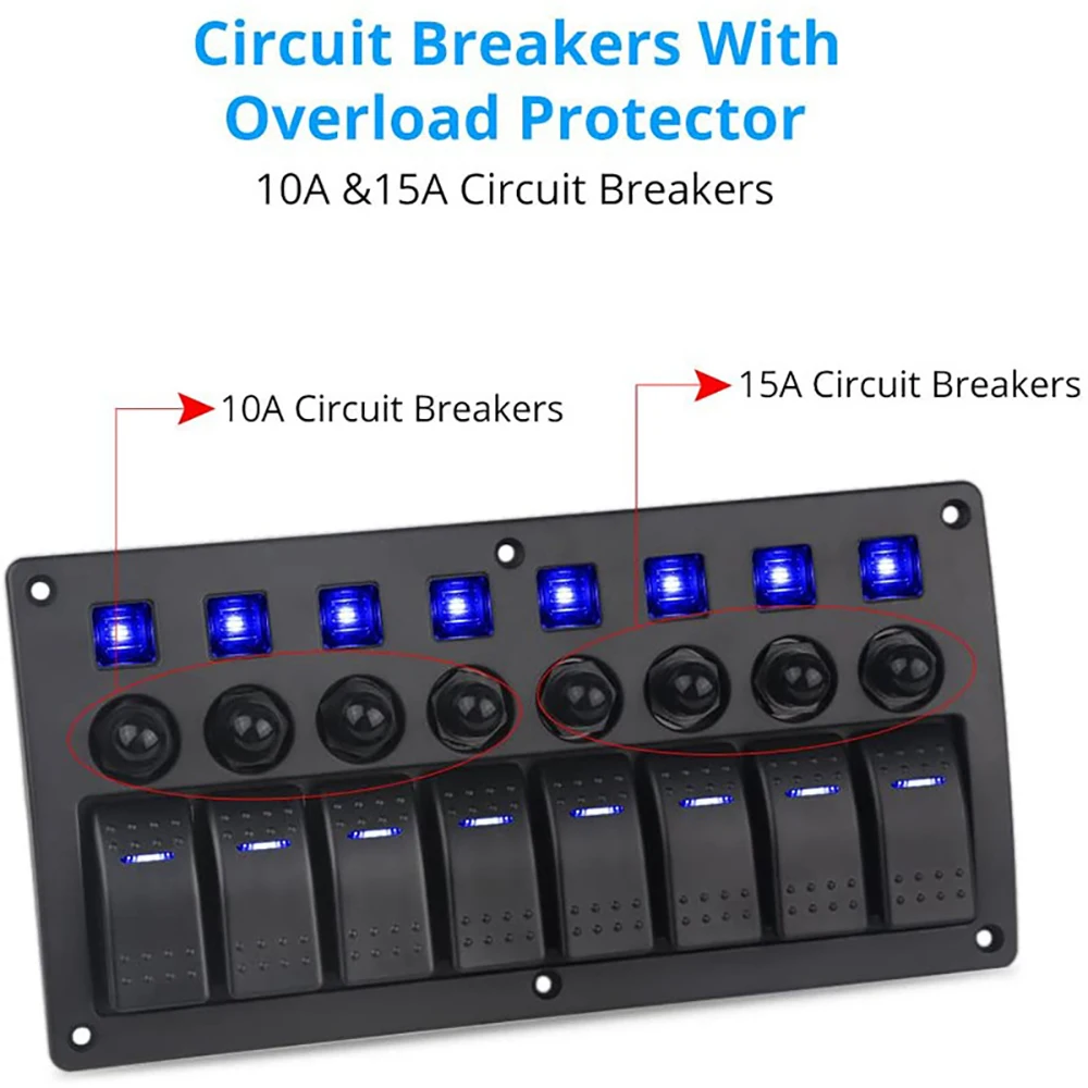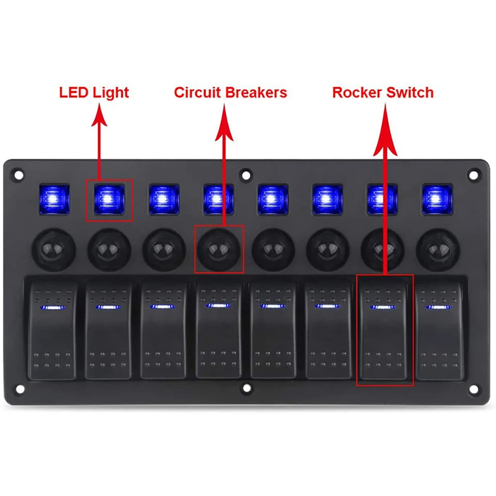 8 Gang Marine Boat Rocker Switch Panel with Circuit Breakers LED Switch Panel 12V 24V for Boat RV Camper Truck Accessories
