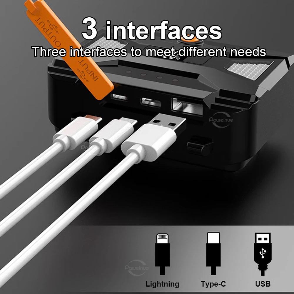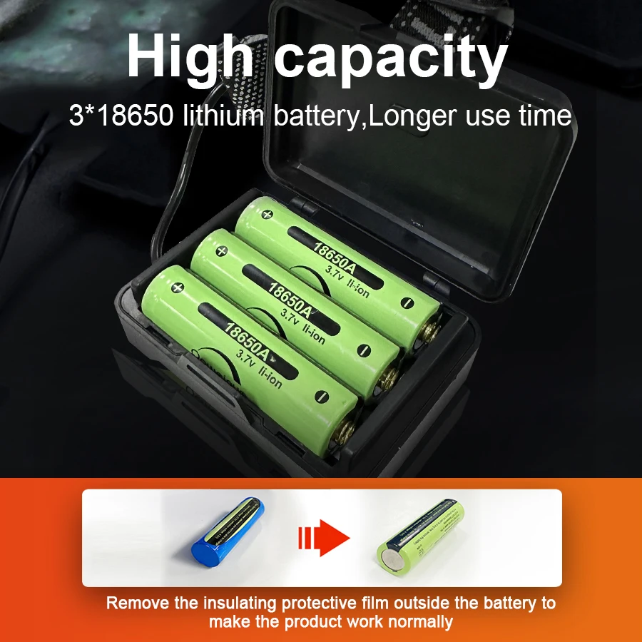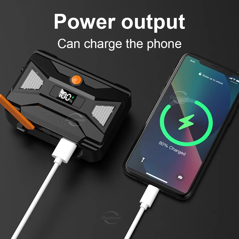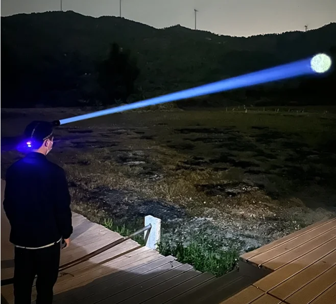 This headlamp uses a new ultra-long-range 800W LED wick, which is specially designed for long-distance and can easily illuminate more than 3500 meters! More powerful and shining than ordinary headlights and XHP360. We also designed an infrared sensor switch for this long-range headlamp, which can free your hands, this feature is very suitable for work, fishing and various outdoor activities. The headlight has a digital power display, emergency taillight, and two charging methods (Type C and Lightning charging). The headlight's head housing features an innovative fluorescent light that automatically emits colored fluorescent light at night, allowing you to find the headlight at a glance even in the dark.